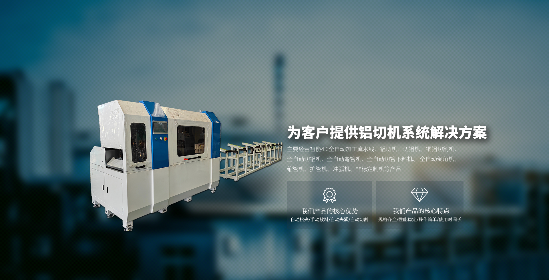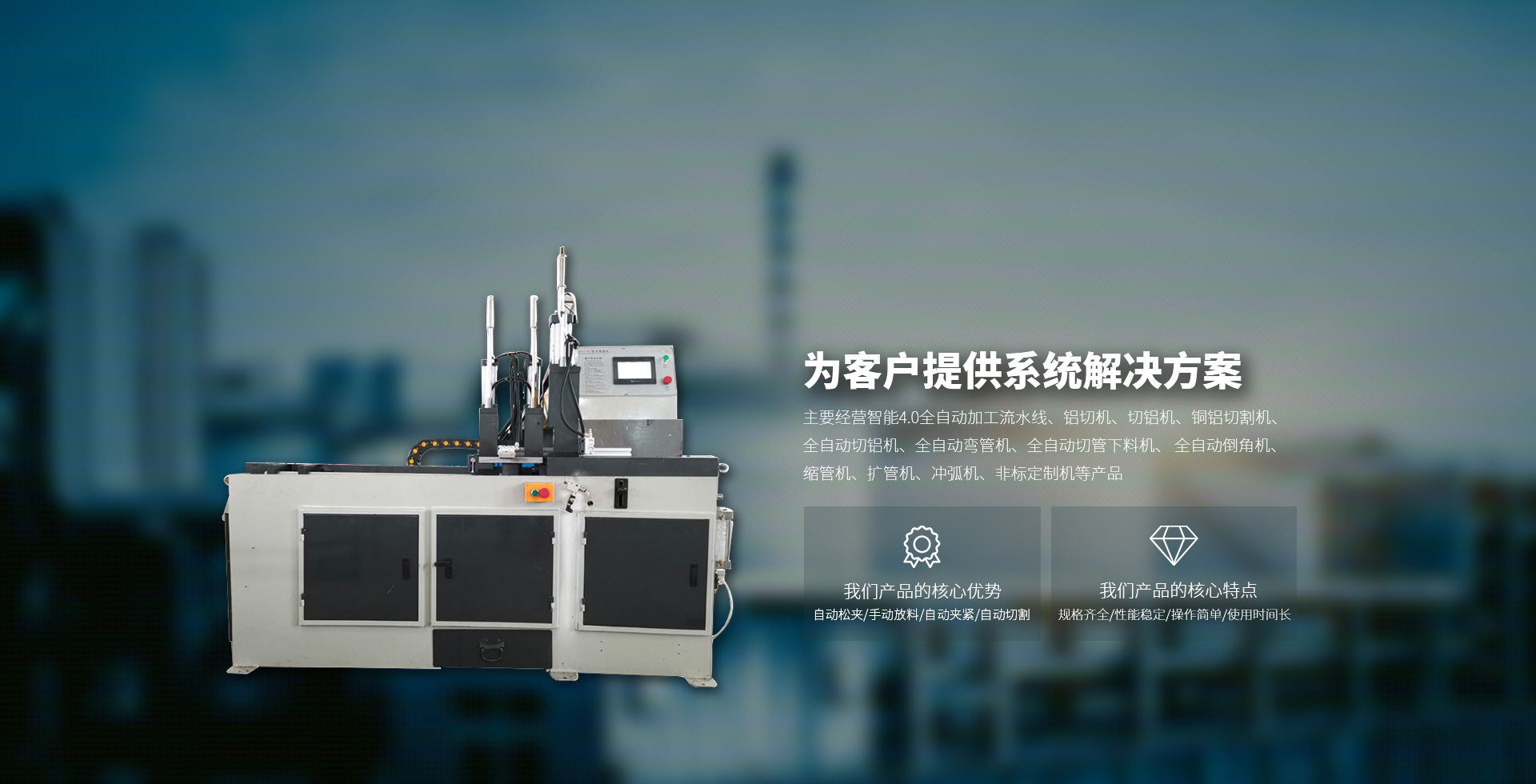 我們產品的特點主要經營智能4.0全自動加工流水線、鋁切機、切鋁機、銅鋁切割機、全自動切鋁機、全自動彎管機、全自動切管下料機、 全自動倒角機、縮管機、擴管機、沖弧機、非標定制機等產品
